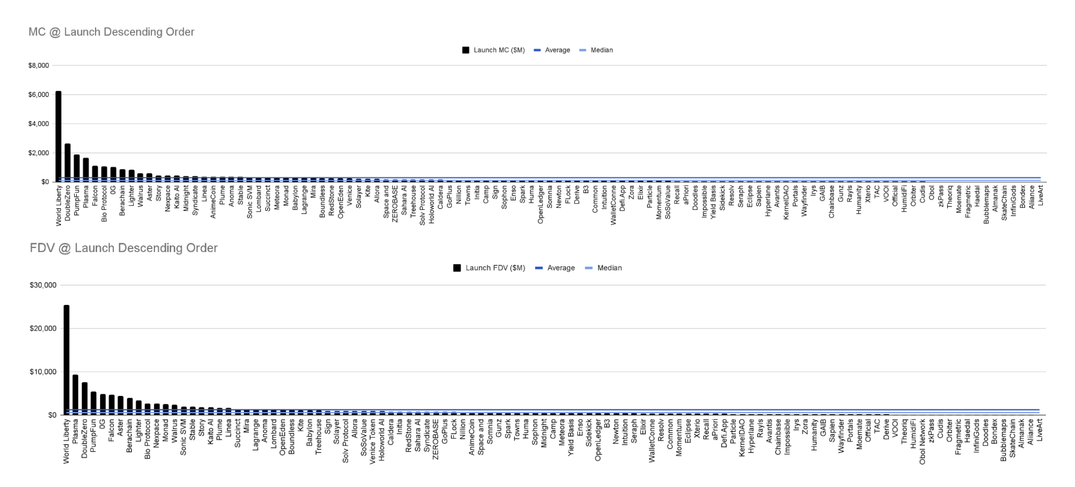 In 2025, new token launches averaged a $291M MC (median: $105M) and a $1.3B FDV (median: $593M). Altogether, the 109 tracked launches created $138B in market value at TGE.