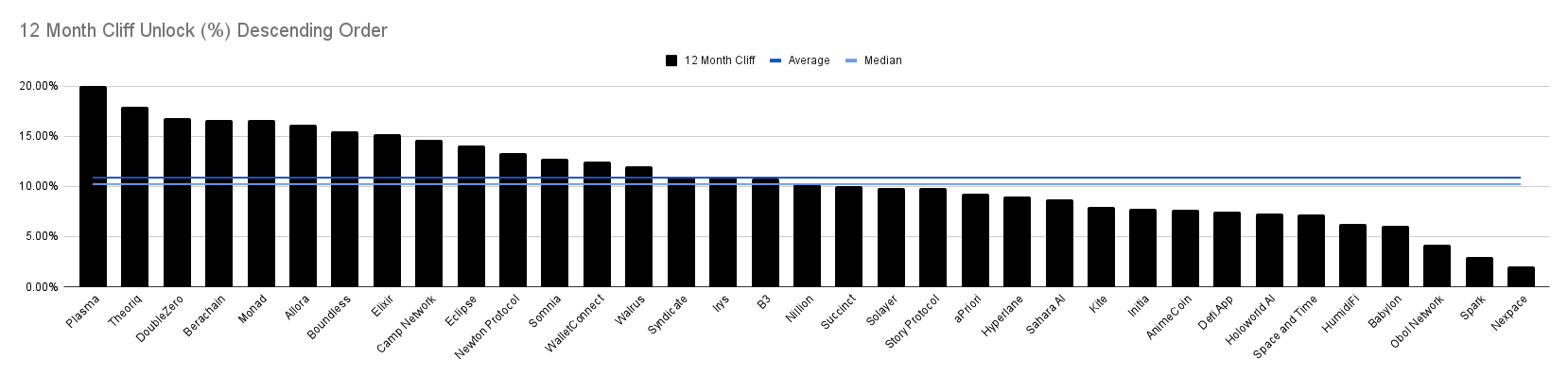 Of the 109 benchmarked tokens, only 35 projects had non linear 12-month cliff unlocks, with an average of 10.90% and median of 10.25%. These unlock mechanisms are often times detrimental to token performance as the cliff period approaches.